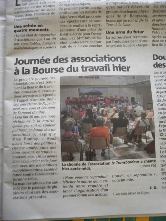 je remercie les associations présentes ce jour là, ainsi que le public venu nombreux découvrir dans la joie et la bonne humeur les activités pratiquées. Et merci à la Chorale du Transbordeur qui nous a enchanté par quelques unes de ses chansons (la SACEM a été payée, pas la peine de me dénoncer...). Quelques photos vont arriver...