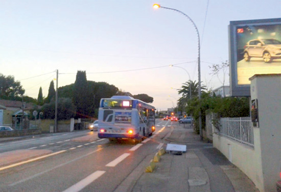 Là, on se demande pourquoi les séparateurs de chaussée sont si larges ! les bandes cyclables sont d’autant plus réduites, et dans le cas du passage d’un bus, aucun écart ne sera permis du côté cycliste (ne parlons pas du rond-point de Mar vivo, où la bande disparait, idem à l’opposé au bout de l’avenue vers Les Sablettes ) la faute, encore et toujours à des séparateurs disproportionnés!