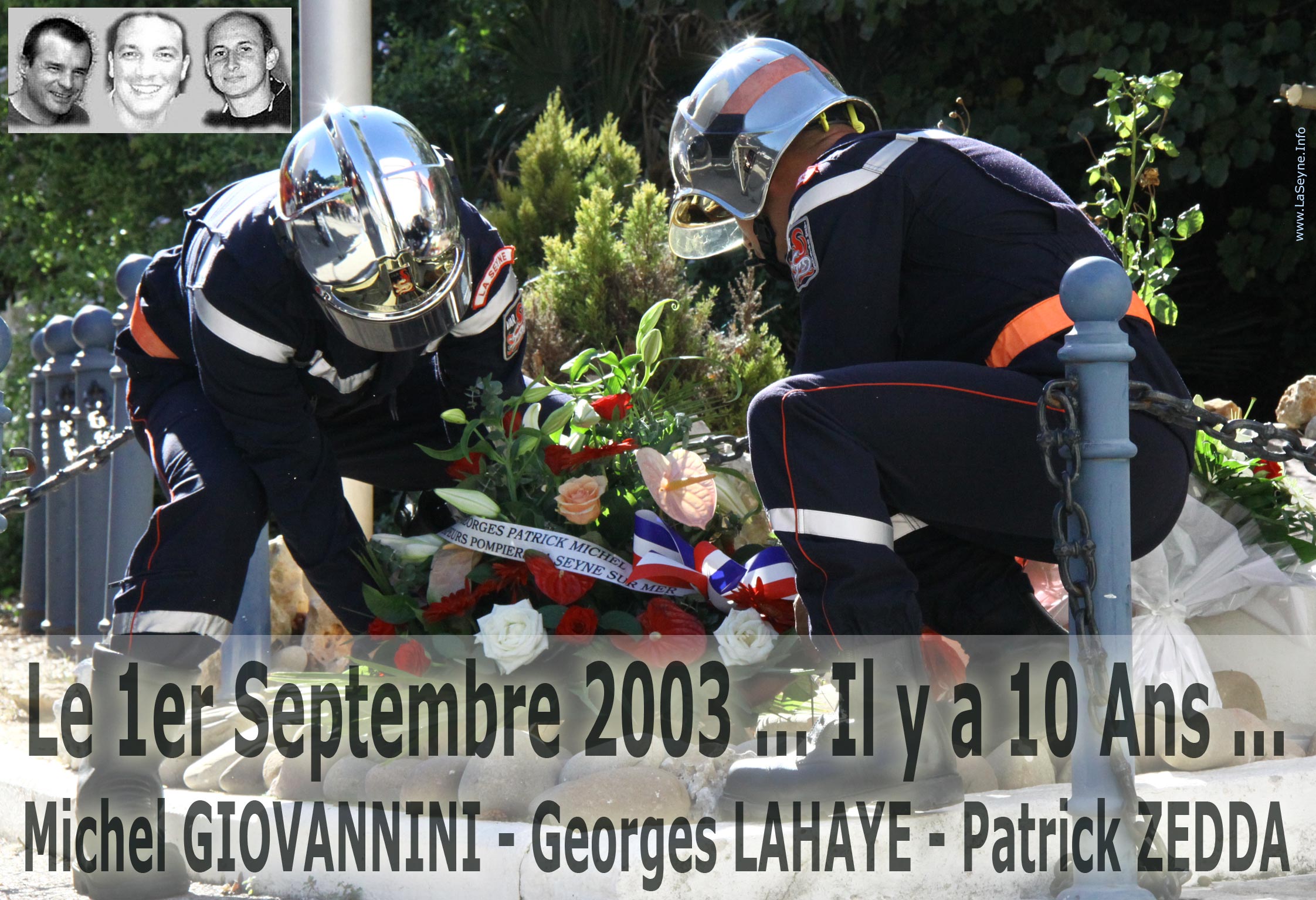 Ils sont morts au feu, dans le feu, engloutis par le brasier, perdus à jamais sur cette petite route au milieu du massif des Maures, un premier septembre 2003. Une décennie a passé et la blessure est restée. Comme remplie de cendres. Les trois pompiers seynois Michel Giovannini, Georges Lahaye et Patrick Zedda sont absents à jamais.