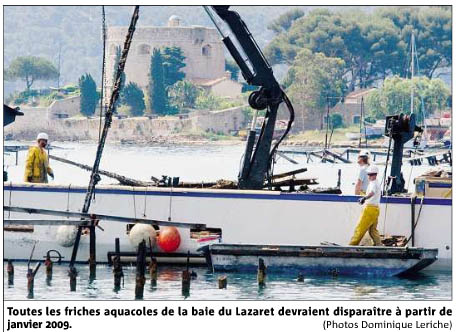 Le chantier, d'un montant de 375 000 euros HT, prendra fin avant le mois de juin, pour reprendre de plus belle dès janvier 2009. La tranche ferme concerne l'arrachage des pieux en fiche sur les sites, ainsi que le nettoyage des fonds de l'anse de Balaguier par enlèvement des pieux en amas.
