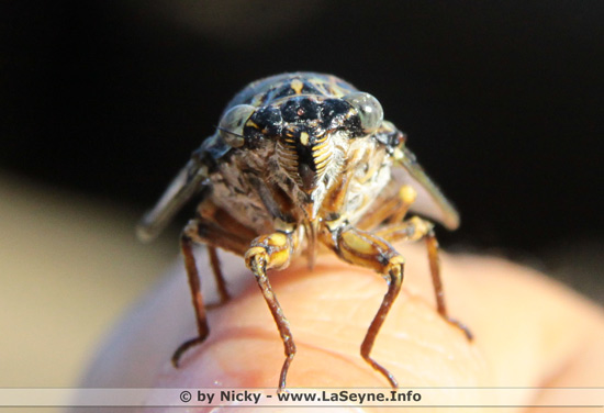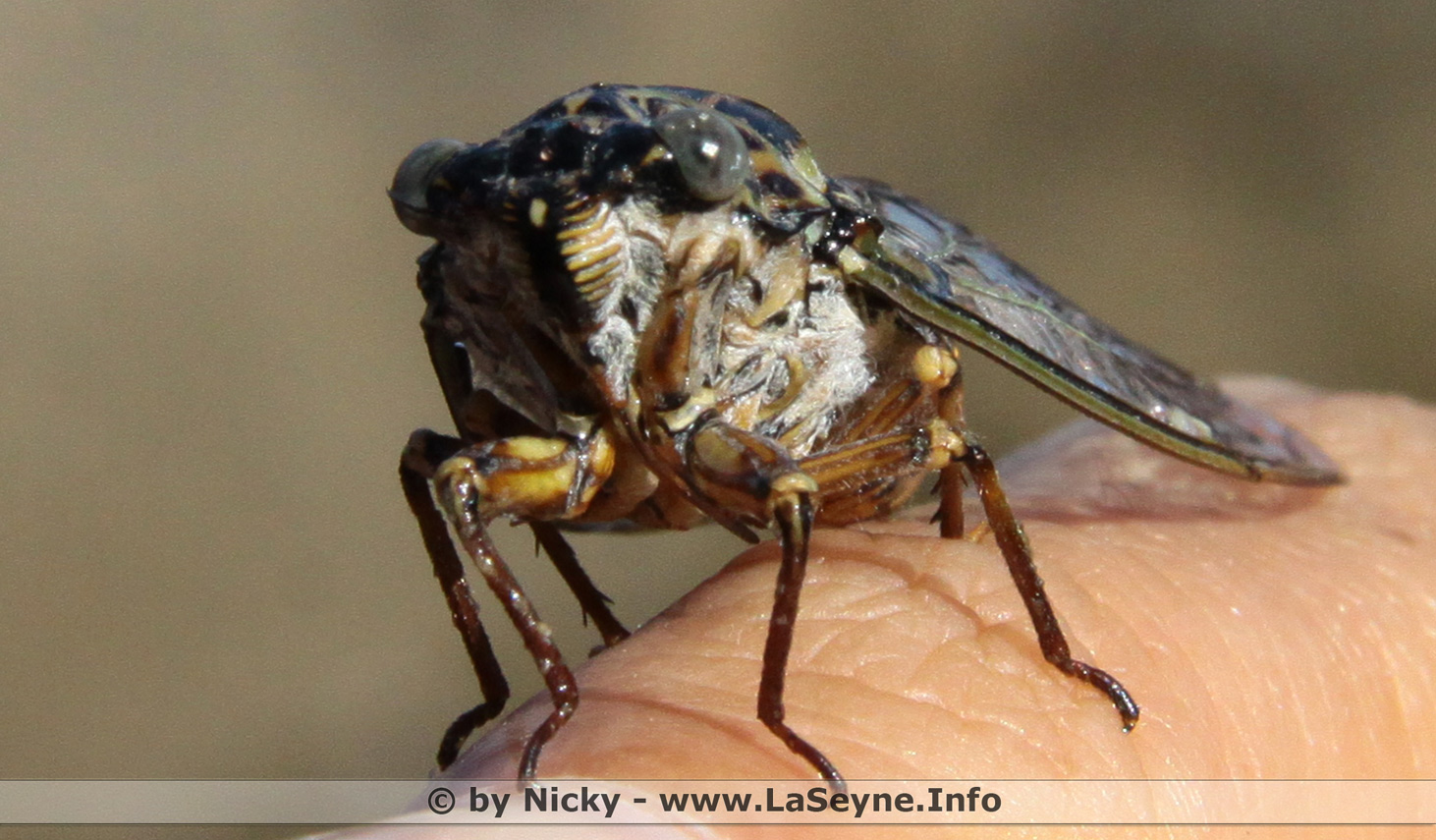 La cigale fait partie de la classe des Insectes, de l'ordre des Homoptères. Sa tête est de couleur bleu gris. Ses deux petits yeux sont noirs et grands. Ses pattes sont poilues et grâce à ces poils, elles collent aux branches