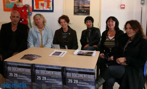 De droite à gauche, Nathalie Trezza, réalisatrice, Jeanine Arnaldi, directrice de l'Espace Tisot, Marie-Pascale Attallah, coordinatrice des ateliers de l'image, Florence Cyrulnik, adjointe à la culture et au patrimoine, Gérard Rinaldi, réalisateur et Boualem Amedjoum, programmateur de l'Espace Tisot.