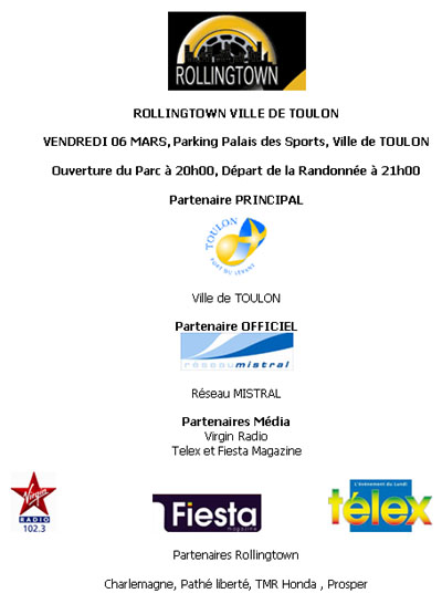 ROLLING TOWN VILLE DE TOULON - VENDREDI 06 MARS 2009DEPART PARKING PALAIS DES SPORTSOUVERTURE DU PARC A 20H00 - DEPART RANDONNEE A 21H