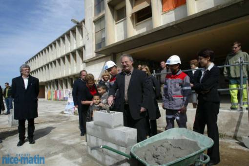 Le maire Marc Vuillemot, entouré de la sous-préfète du Var Caroline Gadou, de l'inspectrice de l'Éducation nationale Michèle Bernard, des élus seynois et de jeunes écoliers, a posé hier la première pierre de la reconstruction des écoles Giono et Malraux, devant une cinquantaine de personnes : d'anciens et actuels enseignants et directeurs, des parents d'élèves et des habitants du quartier.