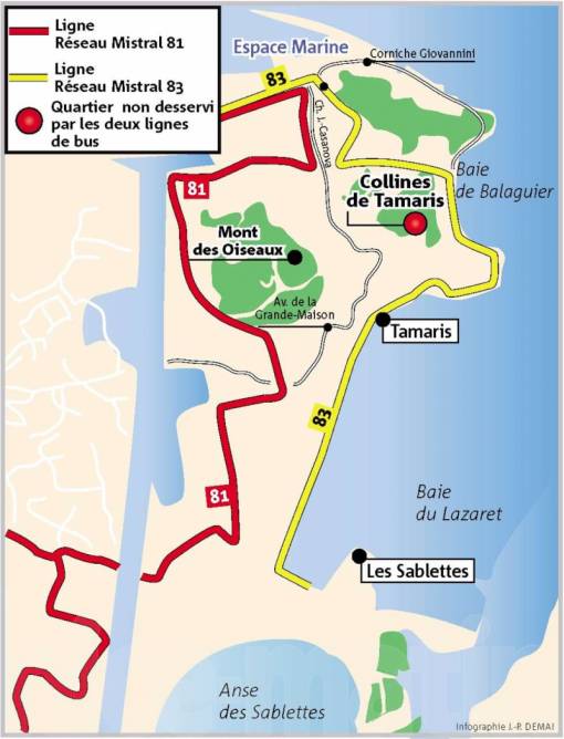 L'avenue de la Grande Maison (côté Tamaris) prolongée par l'avenue des Collines de Tamaris (qui rejoint le boulevard de la Corse Résistante), n'est pas empruntée par les transports en commun. Sur la carte du réseau Mistral, on voit d'ailleurs le « trou » laissé par les lignes 83 (Léry/Sablettes) et 81 (Langevin/Fabrégas) qui contournent la colline sans la traverser. Résultat : plusieurs centaines de logements sont tenus à l'écart des lignes de bus.
