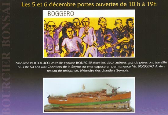 Toutes les oeuvres d'Alain Boggero trouvent refuge chez Bourcier Bonsaï, sur la route d'Ollioules. Ce samedi et dimanche, 5 et 6 Décembre 2009, il y a une journée portes ouvertes. Vous pourrez y admirer ses nombreuses peintures sur les ouvriers des chantiers et vous serez accueillis avec du vin chaud.