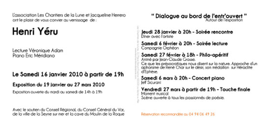 Toute l’équipe des Chantiers de la Lune vous souhaite une excellente année 2010 et a le plaisir de vous convier au vernissage l’exposition d’Henry Yéru le 16 janvier à partir de 19 heures.