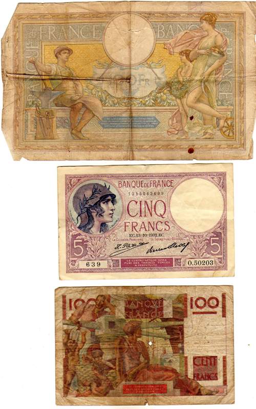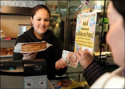 Une personne paie une galette avec un ancien billet de cent francs le 19 Janvier 2010 au Blanc.