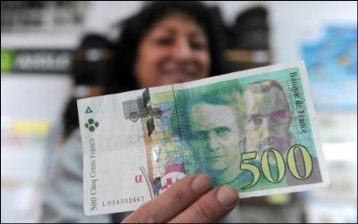 Une personne paie un achat avec un ancien billet de cinq cents francs et récupère sa monnaie en euros le 19 Janvier 2010 au Blanc