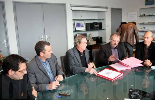 De gauche à droite : Jean-Luc Bruno vice-président de l'office HLM « Terres du Sud-Habitat », Joël Canapa, directeur, Henri Tite-Grès, président de la Mutuelle de la Méditerranée, Marc Vuillemot, maire de La Seyne et Gérard Rousseau, directeur de la mutuelle. Le maire et Henri Tite-Grès ont paraphé hier, en mairie, la convention de partenariat ouvrant l'accession des logements sociaux de la mutuelle aux victimes de l'amiante.