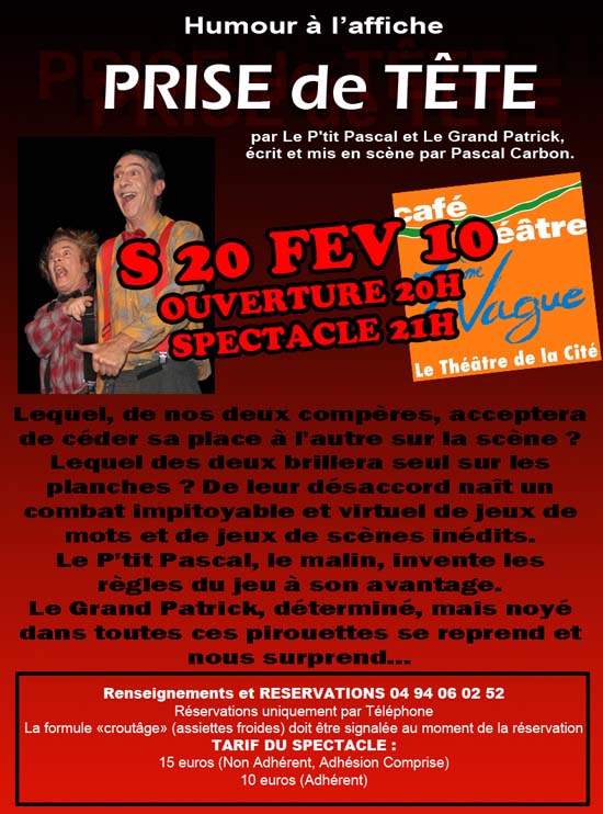Prise de Tête le Samedi 20 Février 2010Café Théâtre "7ème Vague"38, rue Berny83500 La Seyne sur MerTéléphone : 04 94 06 02 52