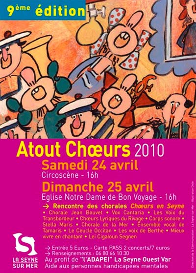 Assuré du soutien du service culture de la Ville, ce neuvième « Atout Choeur » sera dédié comme chaque année à une association à but social. C'est l'Adapei du Var (Association départementale de parents et amis de personnes handicapées mentales) qui bénéficiera de la générosité des auditeurs. Présentée par le dynamique président de l'ouest-varois, Laurent Vaccon, l'Adapei, fondée en 1961, accueille plus de 800 personnes, enfants et adultes, dans ses établissements situés à Toulon, Saint-Tropez, Hyères, Fréjus, Draguignan, Brignoles et La Seyne. Elle emploie 450 accompagnateurs dans ses 21 structures, foyers d'hébergement, foyers occupationnels, CAT, etc.