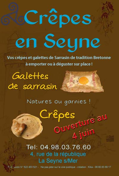 "CRÊPES EN SEYNE" est ouvert depuis le 5 juin 2010 et propose des crêpes et galettes de sarrasin à emporter ou à déguster sur place aussi bien natures que garnies comme en Bretagne d'où je suis originaire et appris mon métier de crêpière.