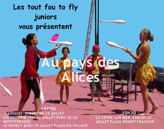 Sous la direction des membres de la compagnie Tout Fou To Fly, les artistes en herbe de l'école de cirque contemporain vous présenteront le résultat de leur travail avec un spectacle sur le thème d'Alice au pays des merveilles. A ne pas manquer le vendredi 31 juillet 2010 à 10h30, place Benoît-Frachon.