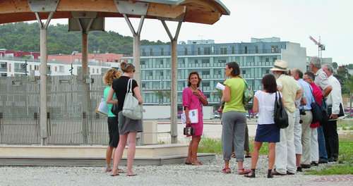 L’échangeur thermodynamique, installé au bout du parc de la Navale, est à moins de 500 mètres des logements neufs de Porte-Marine 2 (en arrière-plan). Désormais, l’énergie produite par la ville ne sera plus complètement gaspillée, comme l’explique Raphaëlle Leguen, première adjointe (en rouge). (Photos Éric Estrade)