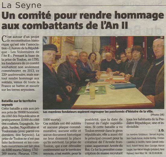 L'association a eu sa quatrième réunion ce mercredi 12 janvier chez le président, Jean-Michel Miraglio. Elle fut fructueuse et le bureau était suspendu aux lèvres des historiens du groupe. Les idées fusèrent à cette occasion, et l'on sent que la "mayonnaise" commence à prendre. Après que chacun ait donné son avis, des décisions ont été prises. L'action se portera tout d'abord sur la recherche de documents, sur la préparation d'expositions et de conférences en direction de la population , des écoles, des associations et autres personnes morales susceptibles d'être intéressées par cette période qui vit naître cette démocratie qui près de trois cents ans plus tard est encore un modèle pour le monde entier. Cette action atteindra son apogée en 2013 par une manifestation d'envergure qui reste encore à déterminer, mais pour laquelle le groupe a déjà quelques idées. Mais pour que cette célébration soit l'affaire de la population seynoise et varoise, pour qu'elle ne soit pas seulement un rêve dans l'esprit de quelques passionnés certes, mais isolés dans leur tour d'ivoire, nous prenons contact avec les corps constitués de la région (municipalités, militaires, etc... voire - plus ambitieusement, ambassades.) Bien évidemment, nous n'occulterons pas les individualités qui avec nous, pourront mener à bien cette tâche, et nous prions les bonnes volontés - quelles qu'elles soient- et dans la mesure du temps qu'elles voudront bien nous accorder, à prendre contact avec nous afin que se projet se réalise.