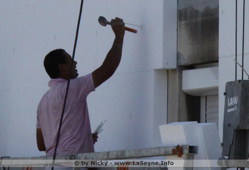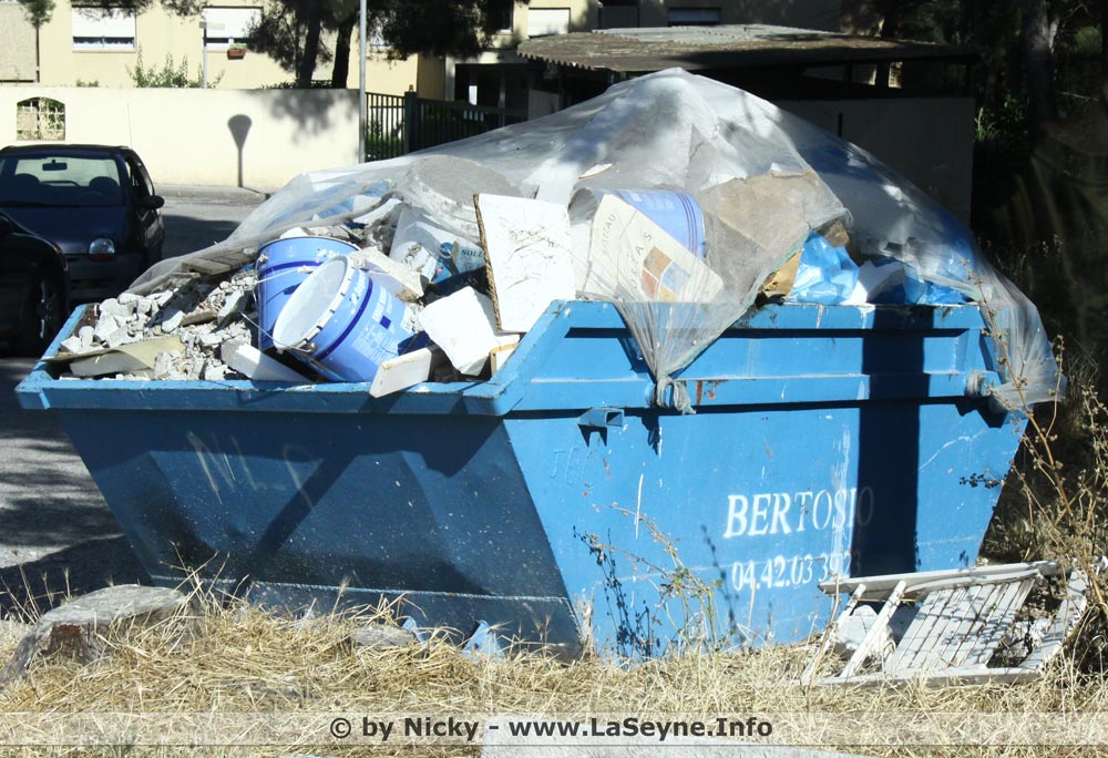Les ouvriers ont déposé une énorme benne à ordure où il jette toutes leurs chutes... en lisière de forêt. Les morceaux de polystyrène s'envolent au grès des rafales de mistral (fréquentes en ce moment).