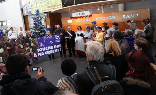 Une centaine de personnes, élus, syndicalistes, associatifs, dont les rameurs de la Traversée de l'espoir, étaient derrière eux, autour de banderoles revendicatives, dont une sur laquelle figurait la photo d'une « crèche de combat ».