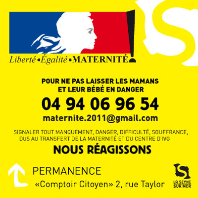 Serge FERAUD a écrit :Mesdames et Messieurs les Présidents d'Association de la Seyne sur merVous n'êtes pas sans savoir que notre maternité de La Seyne va fermer et semble t-il très rapidement. Le Maire de la Seyne, ainsi que ceux d'autres Communes limitrophes, St Mandrier, et Ollioules mènent le même combat, pour que notre Hôpital de proximité de La Seyne et en particulier la maternité, ne ferment pas.