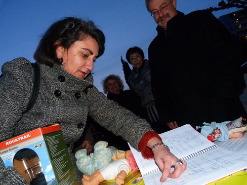 Hier soir devant la maternité, le maire et ses soutiens faisaient le décompte des signatures glanées dans la journée. Plusieurs centaines ont déjà été réunies en un peu plus de vingt-quatre heures. (photo: J. P.)