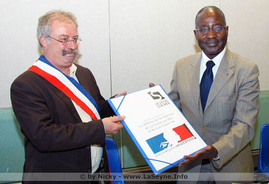 Le maire de La Seyne, Marc Vuillemot, a signé la Charte des communes des nations pour la paix avec le président de l'Observatoire international pour la non-violence, Albert Konan-Koffi.