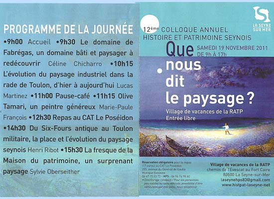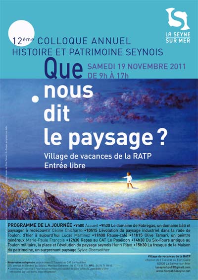 L'association Histoire et patrimoine seynois organise, samedi 19 novembre de 9 heures à 17 heures, avec le soutien de la Ville son 12e colloque sur le thème « Que nous dit le paysage? » au village de vacances de la RATP, chemin de l'Evescat.