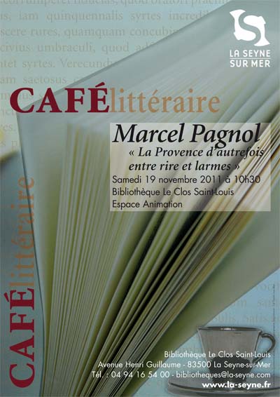 L'espace animation de la bibliothèque Le Clos Saint-Louis, avenue Henri Guillaume, accueillera samedi 19 novembre à 10h30 un café littéraire sur le thème « Marcel Pagnol, la Provence d'autrefois entre rires et larmes ». Plus de renseignements au 04 94 16 54 00.