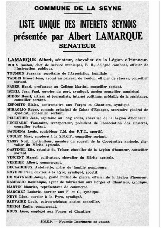 Un DE MAYNARD joseph se présenta au municipales à la Seyne en avril 1953