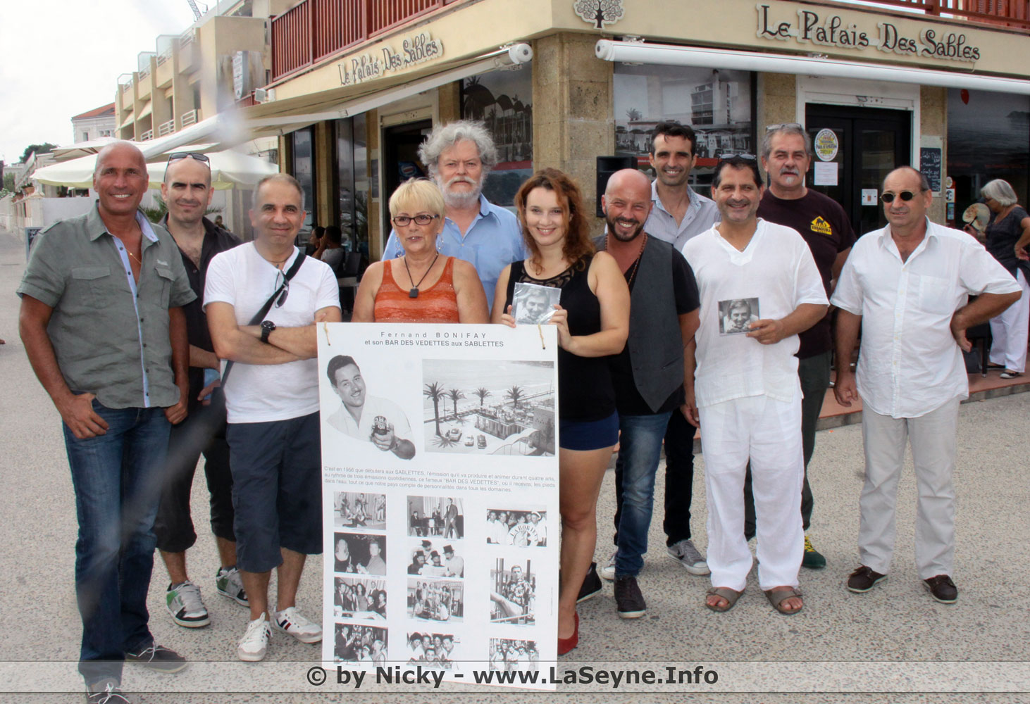 voici la photo de groupe d'une partie des artistes présents à la conférence de presse du 24 août 2013 au "Palais des Sables", ex "Bar des Vedettes" créé par Fernand Bonifay en partenariat avec RMC en 1955.