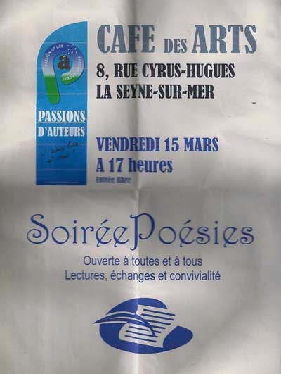 Passions d’auteurs, ces soirées littéraires organisé par l’ami Jo Dechifre, nous vous en avons parlé récemment. La rencontre poésie a eu lieu au café des Arts (Hicham nous régale en ce moment)
