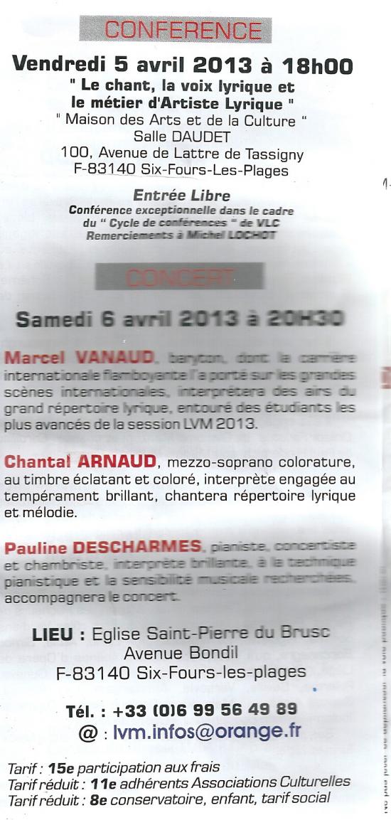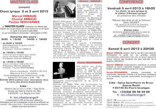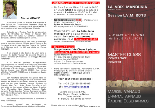 J’ai eu ensuite un entretien avec un des professeurs, Chantal Arnaud, mezzo-soprano colorature, qui est responsable de l’association « La voix Mandukia qui organise du 2 au 6 avril 2013, une master class un concert et une conférence de presse avec Marcel Vanaud , baryton de renommée internationale, Pauline Descharmes et elle-même (voir image).