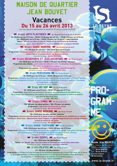 Stages de printemps 2013 - Du lundi 15 avril au vendredi 26 avril à la Maison de quartier Jean Bouvet ... Agrandir - cliquez ici