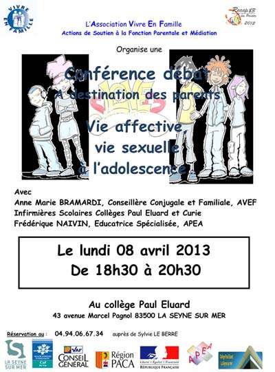 Une conférence/débat sur la Vie affective, vie sexuelle à l’adolescence lundi 08 avril 2013