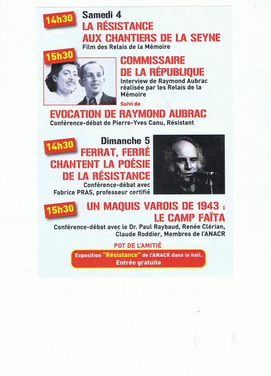 Le dimanche 05, conférence de Fabrice Pras, "Les passeurs de Mémoire: Ferrat et Ferré chantent les poètes de la Résistance". Suivra une conférence sur un maquis varois: "Le camp Faïta".