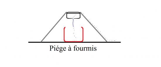 Les fourmis une fois gavées s'échappent part le trou et le fil puis tombent dans la boite remplie de Pastis