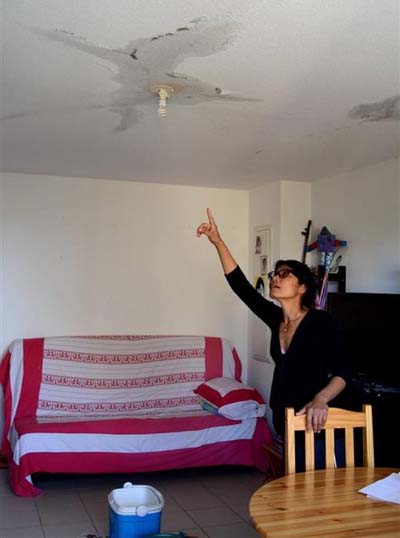 Des journaux ouverts jonchent le sol du salon. Dessus, des seaux sont soigneusement disposés afin de recueillir les gouttes qui ne cessent de tomber du plafond depuis les fortes pluies de samedi. L’électricité, elle, est coupée pour prévenir tout danger. Depuis près de deux ans, à chaque intempérie, l’appartement de Parichat Tapparat, au second étage des Jardins de Mathilde, se transforme en piscine.