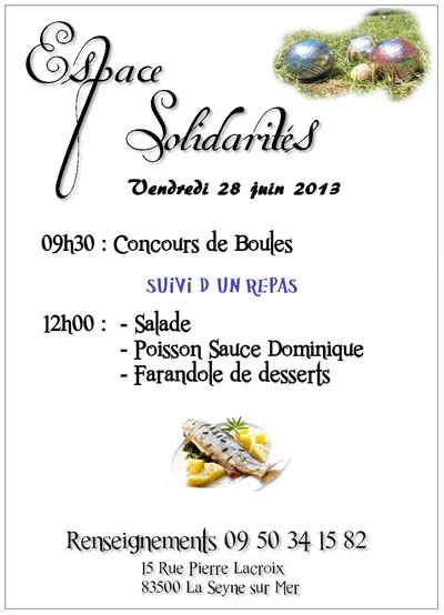 Concours de boules suivi d'un repas VENDREDI 28 JUIN 2013 à l'Espace Solidarités