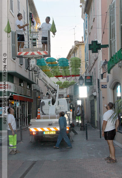 Pour réussir cette première action, les services techniques municipaux ont relevé un sacré défi car il s’agit, rue Cyrus Hugues, de faire tenir pas moins de 244 parapluies (offerts par Auchan) au-dessus de nos têtes, tout en tenant compte d’éventuelles journées venteuses.