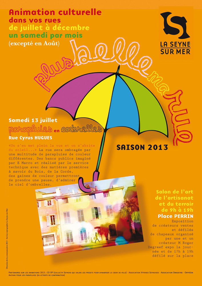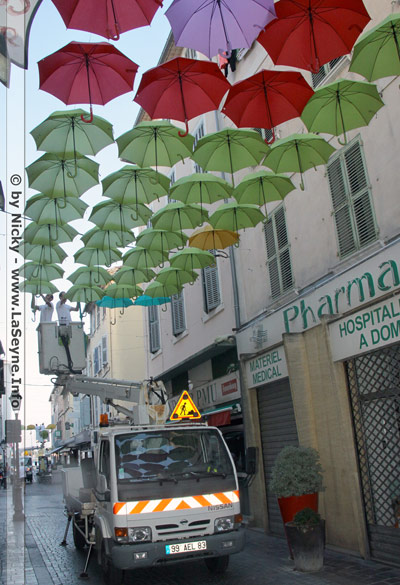 Insolite spectacle à découvrir le samedi 13 juillet et les jours suivants en centre-ville de La Seyne-sur-Mer : la rue Cyrus Hugues sera en effet recouverte d’'une prairie de parapluies pour vous en mettre plein la vue !
