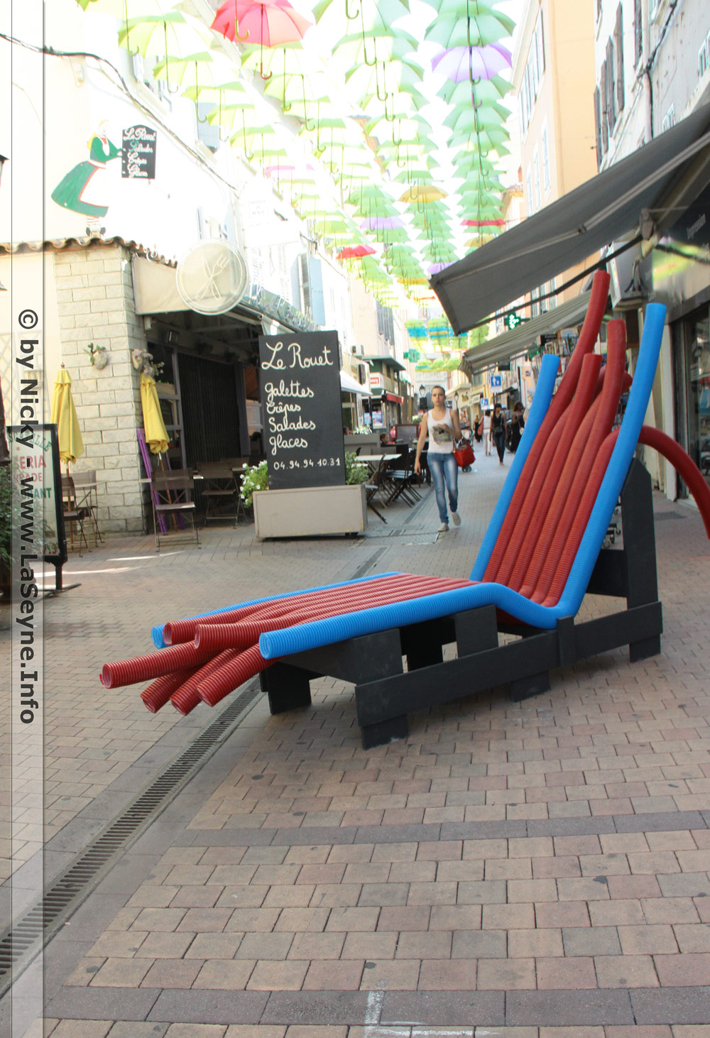 La rue sera ombragée par une multitude de parapluies de couleurs différentes. Des bancs publics imaginés par Eric Marro et réalisés par les services techniquesavec des matières premières (bois, corde, gaines de couleur) permettront de prendre une pause et d'admirer le ciel d'ombrelles