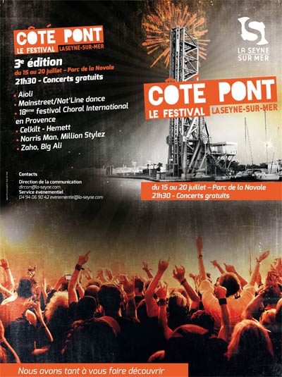 Du lundi 15 juillet 2013 au samedi 20 juillet 2013 au Parc de la Navale au centre ville de lLa Seyne et sur le port ... Des concerts gratuits au Festival Côté Pont 3ème édition à 21h30