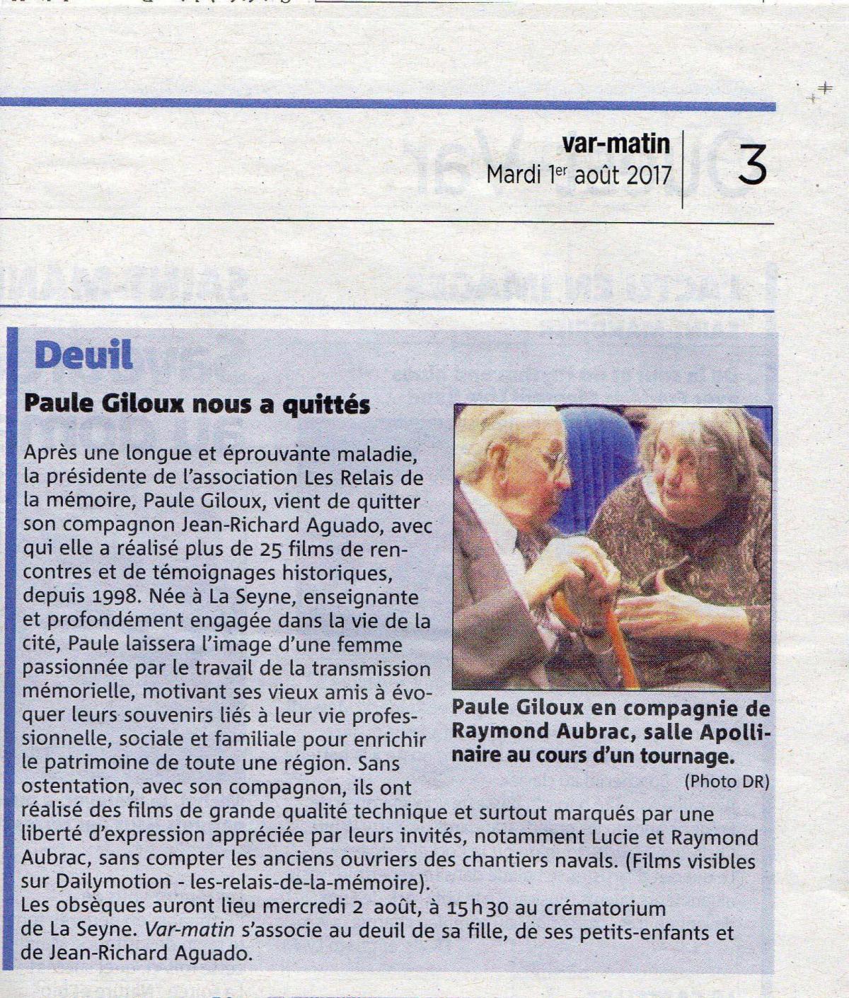 La crémation de Mme Paule Giloux aura lieu le mercredi 02 août au crématorium de La Seyne sur mer (Zone camp Laurent, avant Castorama), à partir de 15h30.