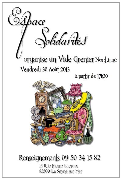 L'Association Espace Solidarités organise un Vide-Grenier Nocturne Le vendredi 30 Août 2013 à partir de 17h30. Pour y participer, merci de nous contacter par téléphone ou via notre site internet.
