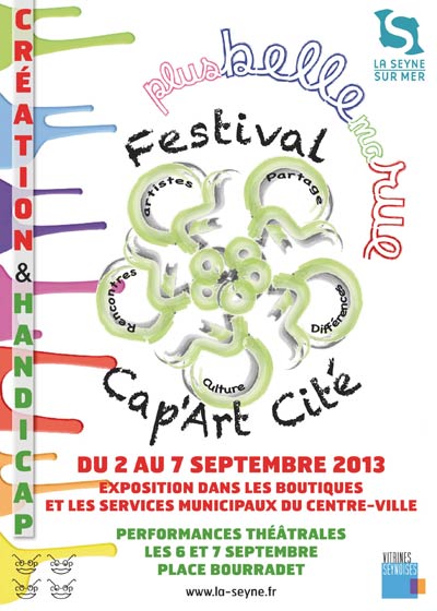 Cap’Art Cité participe à plus Belle ma Rue afin que le centre-ville soit le lieu de toutes les rencontres, de tous les regards. Ce festival, du 2 au 7 septembre 2013, associe les commerçants du centre-ville et la ville de La Seyne pour exposer et produire les réalisations artistiques des personnes en situation de handicap et le travail effectué avec leurs structures d’accueil