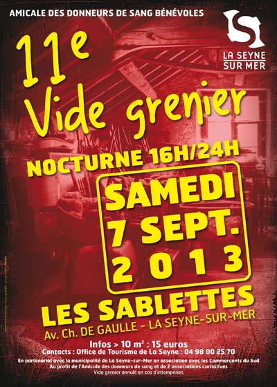 Samedi 7 septembre 2013 de 16 heures à minuit, un onzième vide-grenier sera organisé aux Sablettes par l'amicale des donneurs de sang bénévoles en partenariat avec la Ville et l'association des Commerçants du Sud.