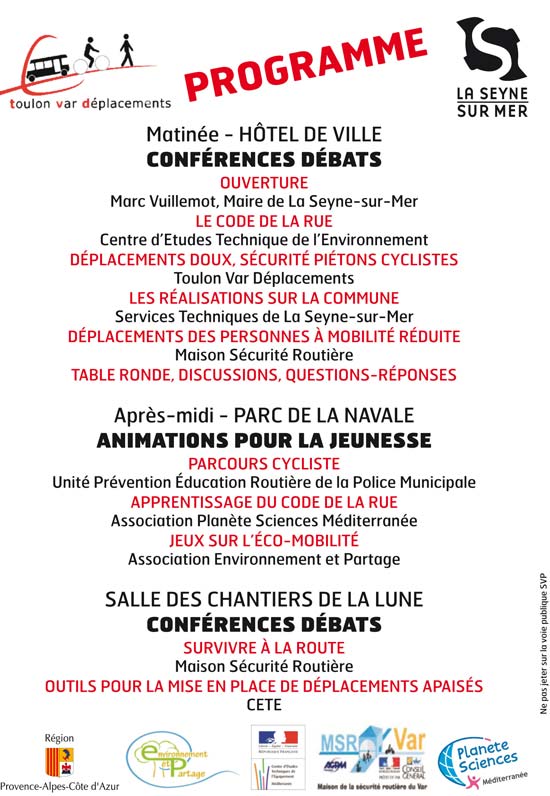 Toulon Var Déplacements (TVD) - l’association « qui défend le droit des piétons, des cyclistes, des usagers des transports en commun et des personnes à mobilité réduite », comme le rappelle son président Maurice Franceschi - présentait avant-hier, à La Seyne-sur-Mer (la seule commune candidate pour l’instant) les initiatives programmées pour le 18 septembre à l’occasion de la journée « Code de la rue ».Une nouvelle opération de sensibilisation à la sécurité routière et au développement durable organisée dans le cadre de la Semaine européenne de la mobilité. En partenariat avec la municipalité de La Seyne, le CETE (ministère de l’Équipement et du Développement durable), le Conseil régional, la Maison de la Sécurité routière, les associations Environnement et Partage et Planète Sciences.