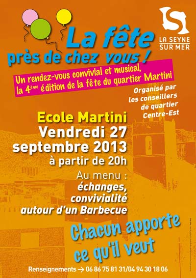 Convivialité: 4e édition de la fête du quartier Martini, le Vendredi 27 septembre 2013 à 20 heures à l'Ecole Martini – rue Jacques Laurent