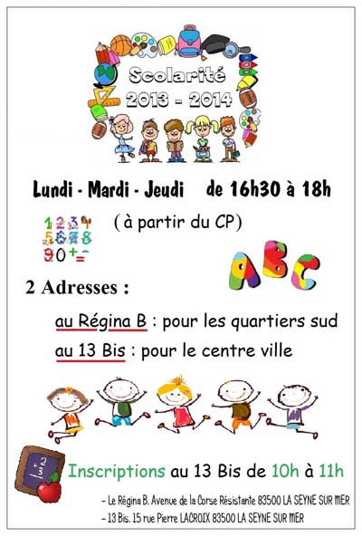 Les inscriptions se font de 10h à 11h au local du 13 Bis, 15 rue Pierre LACROIX 83500 LA SEYNE SUR MER