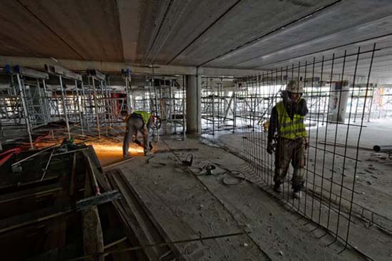 Sept entreprises (maçonnerie, électricité, menuiserie, chauffage-ventilation-climatisation, etc.), sont à pied d'œuvre et jusqu'à 80 hommes (et une femme, grutière) peuvent être présents certains jours. Aujourd'hui, le gros œuvre est presque fini et permet déjà d'apprécier les volumes, souvent impressionnants, qui façonneront cette extension(voir illustrations).7200 m3 de béton et 800 tonnes d'armatures ont été nécessaires.