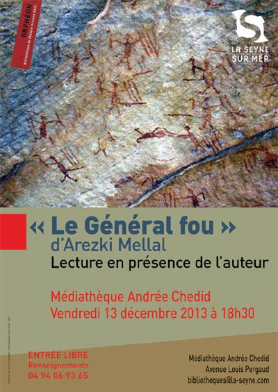Suite à la résidence de l'écrivain algérien Arezki Mellal à la bibliothèque théâtrale Armand Gatti, vous êtes invités à la lecture publique de sa pièce « Le Général fou », vendredi 13 décembre 2013 à 18h30, à la médiathèque Andrée Chedid, 38 avenue Louis Pergaud.